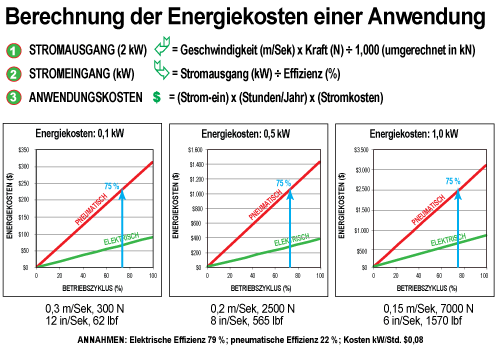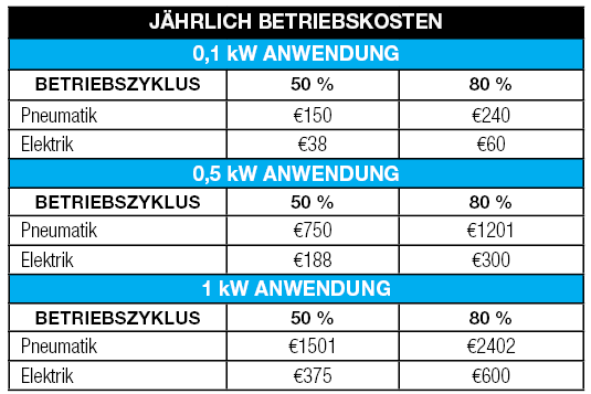 Tabelle 1: Vergleich zwischen pneumatischen und elektrischen Kosten basierend auf Arbeitszyklus und kW