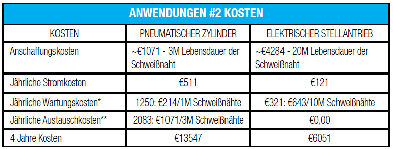 Für dieses Beispiel wird ein pneumatischer Antrieb mit Gesamtkosten von 1071 € mit einer Lebensdauer von 3M Schweißnähten verglichen mit einem elektrischen Servoaktuator mit Kosten von €4284 und einer Lebensdauer von 20M Schweißnähten. Die Gesamtbetriebskosten des Pneumatikzylinders sind doppelt so hoch wie die Option des elektrischen Servoaktuators. Wenn man bedenkt, dass die meisten Automobilwerke Hunderte von Antriebe haben, die Schweißnähte zu einem bestimmten Zeitpunkt ausführen, können die Kosten, die erhöhte Qualität und Leistung sowie die Einsparungen bei der Wartung im Laufe der Zeit erheblich sein.
