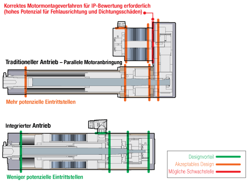 Traditioneller Linearantrieben mit extern montierten Motoren erfordern eine höhere Anzahl an Komponenten. Dadurch kommt es zu einer höheren Anzahl an Verbindungen, die abgedichtet werden müssen, damit kein Wasser in den Antrieb eintritt. Ein Vergleich von zwei Linearantrieben mit ähnlicher Leistung ergab, dass ein traditioneller Antrieb über 10 Dichtungen und 34 externe Schrauben verfügt. Der ähnliche integrierte Aktuator verfügt über 6 Dichtungen und 16 externe Schrauben. Durch die reduzierte Anzahl an mechanischen Verbindungen und Verbindungselementen haben integrierte Linearantrieben im Vergleich zu traditioneller Linearantrieben weniger potenzielle Eindringpunkte. Dadurch sind die integrierten Linearantrieben die erste Wahl für anspruchsvolle Anwendungen, die Hochdruck-Abwasch ausgesetzt sind, und für Außenanwendungen, bei denen die Umweltbedingungen (Regen, Schnee, etc.) dazu führen, dass sich rund um den Antrieb Wasser ansammelt.