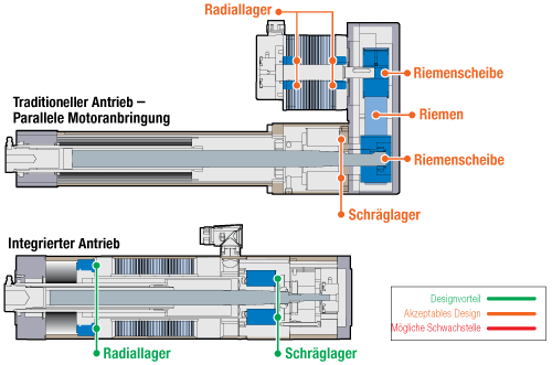Unterschiede in Effizienz und Zuverlässigkeit zwischen integrierten und traditionellen Linearantrieben sind durch die Anzahl der Komponenten für die Drehmomentübertragung und die rotierenden Bauteile in dem jeweiligen System bedingt. Eine Fehlausrichtung und die dadurch bedingte seitliche Belastung beeinflussen die Effizienz der Systeme ebenfalls negativ. Bei der integrierten Version sind nur zwei Stützlager (radiales Lager und Schräglager) erforderlich. Die Ausrichtung wird in der Konstruktion selbst streng kontrolliert. Traditionelle Linearantriebe umfassen wesentlich mehr Bauteile und erfordern drei bis vier Lager: zwei Radiallager im Motor und Unterstützungslager (Schräglager) für die Spindel. Darüber hinaus verwenden traditionelle Linearantriebe mit parallel angebrachtem Motor Riemen und Riemenscheiben. Linearantriebe in Reihenanordnung verwenden Kupplungen. Diese zusätzlichen Komponenten für die Drehmomentübertragung unterliegen Verschleiß, Fehlausrichtungen und möglicher seitlicher Last. Durch erhöhte Reibung und eine niedrigere Zuverlässigkeit des gesamten Systems kann die Effizienz noch weiter beeinträchtigt werden. Integrierte Linearantriebe bestehen aus weniger Bauteilen. Dadurch fallen zusätzliche Lager und Komponenten für den Motoranschluss weg, die Verschleiß unterliegen und defekt sein können. Integrierte Designs sind zuverlässiger. Bei der Motormontage traditioneller Linearantriebe muss auf eine präzise Ausrichtung und auf die Spannung der Riemen geachtet werden. Das Überlasten des Riemens führt zu einer seitlichen Last an der Motorwelle, wodurch die Effizienz sinkt und die Möglichkeit einer vorzeitigen Fehlfunktion der Motorlager ansteigt. Wenn ein Getriebe verwendet wird, senkt die Effizienz des Getriebes die Gesamteffizienz des Systems. Zusammenfassend lässt sich sagen, dass integrierte Linearantriebe die Reibung reduzieren und aufgrund der reduzierten Anzahl an Bauteilen einen höheren Wirkungsgrad aufweisen.