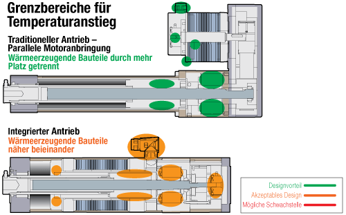besteht darin, ob bei den Dauernennwerten des Antriebs die Temperaturanstieggrenzen aller kritischer Komponenten im System berücksichtigt wurden. Diese kritischen Komponenten sind in der Regel das Isoliersystem des Servomotors, der Rückmelder, die Anschlüsse, die Lager, die Spindel und das Schmierfett. Dauernennwerte für das Aktuatorsystem, die sich auf das gesamte Wärmesystem beziehen, gewährleisten zuverlässige Antriebe mit einer langen Lebensdauer. Leistungsverluste durch Servomotor und Bremsbaugruppen sowie Reibungsverluste aus der Spindelbaugruppe und den Lagern tragen wesentlich zur Wärmeerzeugung im Antrieb bei. Ein traditioneller Antrieb kann mit höheren Arbeitszyklen und höherer Spitzenkraft über einen längeren Zeitraum laufen, da die Leistungsverluste des Servomotors und der Bremsbaugruppe von den Reibungsverlusten der Spindelbaugruppe und der Schräglager getrennt sind, wodurch der Temperaturanstieg des Motors und der Spindelbaugruppe reduziert wird. Durch eine größere Oberfläche trägt dies zu einem Anstieg der Wärmeübertragung durch natürliche Konvektion bei. Dank dieser Eigenschaft sind herkömmliche Aktuatoren die empfohlene Technologie für Anwendungen bei erhöhten Umgebungstemperaturen. Ein integrierter Antrieb positioniert mit seiner kompakten Bauweise die Servomotorwicklung in unmittelbarer Nähe zur Spindelbaugruppe, wodurch wiederum die Leistungsverluste der Wicklung und die Reibungsverluste in unmittelbarer Nähe zueinander liegen. Diese Art von Konstruktion erhöht beim Ausführen von Anwendungen mit hohem Arbeitszyklus oder hoher Spitzenkraft mit hoher Wahrscheinlichkeit den Temperaturanstieg aller kritischen Systemkomponenten.