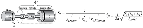 Abbildung 13: Äquivalentes Motorlastmodell (reflektierte und motorische Trägheit) – Gesamtdrehsteifigkeitsgleichung – Systemresonanzfrequenzgleichung