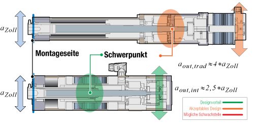 Abbildung 15: Der Schwerpunkt von integrierten Linearantrieben liegt näher an der Montageseite. So wird eine höhere Toleranz gegenüber Stoßbelastungen und Vibration gewährleistet.