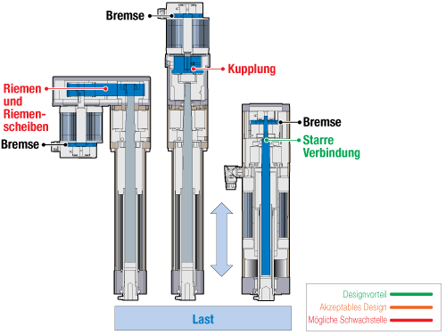 Die Auswahl der Antriebstechnologie spielt eine wichtige Rolle bei der Sicherheit für vertikale Anwendungen, bei denen die Steuerung der Antriebsposition und -last (Werkzeuge) in Leistungsverlust- oder Bauteilausfallszenarien für die Produkt- oder Bedienersicherheit von entscheidender Bedeutung ist. Sowohl herkömmliche als auch integrierte Antriebsbaugruppen verwenden Haltebremsen, um den Motorrotor bei Leistungsverlust anzuhalten. Traditionelle Antrieb-Designs verwenden einen externen Motor mit einem Riemen- oder Kupplungssystem zwischen Bremse und Spindel. Im Falle eines Versagens von Riemen oder Kupplung käme es zu einer sich frei bewegenden oder unkontrollierten Antriebsstange und Werkzeugmasse. In diesem Szenario wäre die Bremse aufgrund des defekten Kupplungssystems nicht in der Lage, die Antriebslast vom Fallen abzuhalten oder diese zu steuern. Ein integriertes Antriebsdesign ist ideal für vertikale Anwendungen, bei denen es Sicherheitsbedenken gibt. Die starre Verbindung behebt die potenziellen Schwachstellen zwischen der Bremse und der Spindel des Antriebs. Dieses Design stellt sicher, dass die Bremse im Fall eines Stromausfalls mit der Antriebspindel zusammenarbeitet und die Spindel am Drehen hindert.
