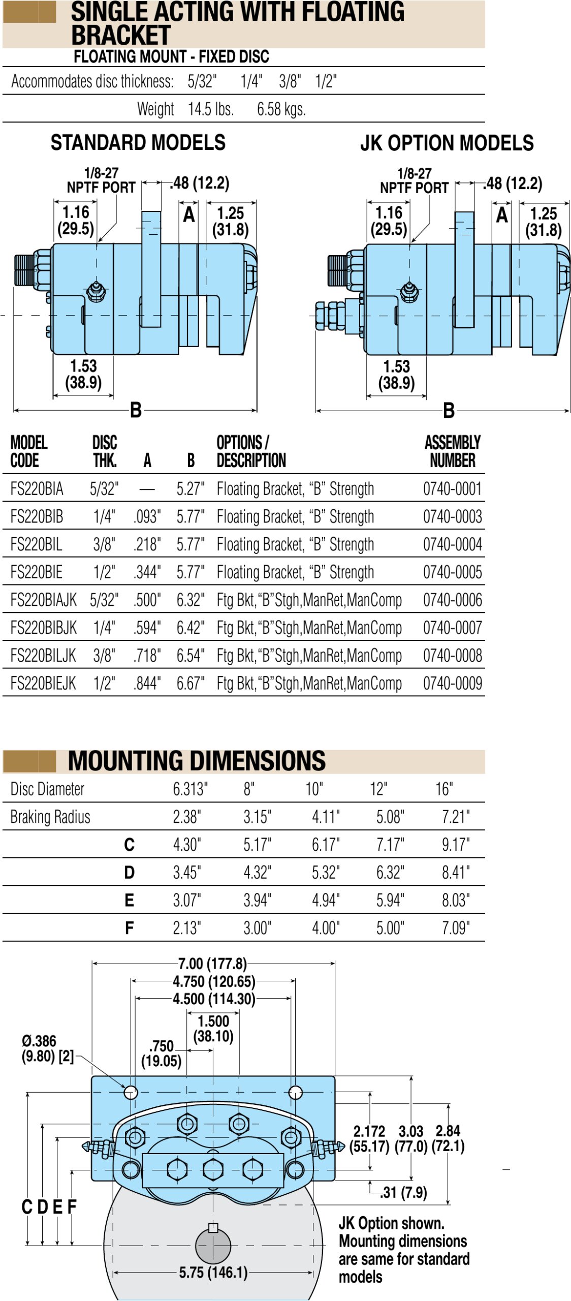 Die Federdruck-Scheibenbremsen der Serie FS220BI bieten bis zu 763 Nm (6750 in-lb) statisches Drehmoment (basierend auf verschleißfreien Belägen). FS220BI Federdruck-Scheibenbremsen sind einfachwirkend mit Festscheibe für schwimmende Montagen.