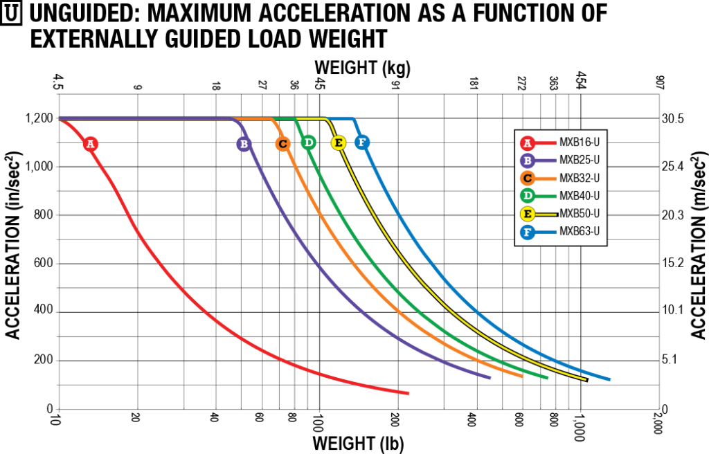 MXB-U Maximale Beschleunigung in Abhängigkeit vom Lastgewicht