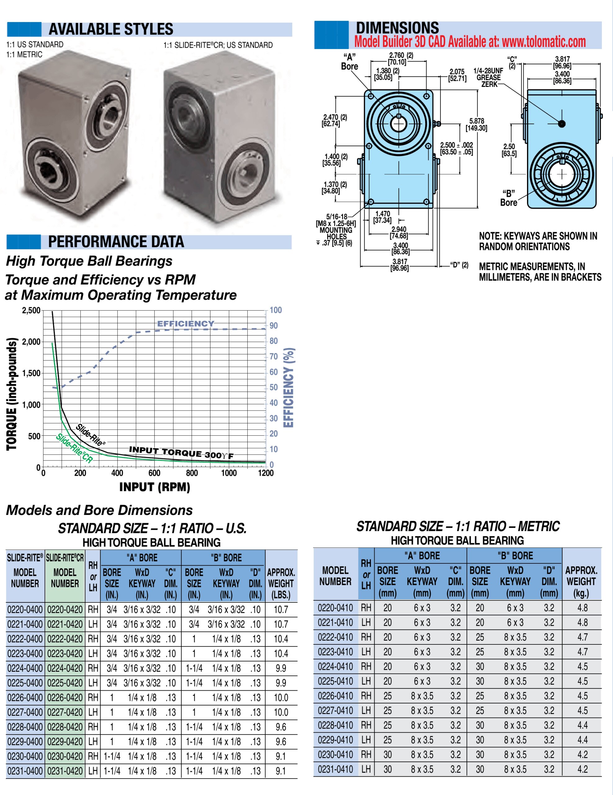 Das rechtwinklige Slide-Rite® Standardgetriebe mit 1:1 Übersetzung bietet ein Drehmoment von bis zu 280,2 Nm (2480 in-lb) und damit die höchste Drehmomentausgabe der gesamten Slide-Rite® Serie.