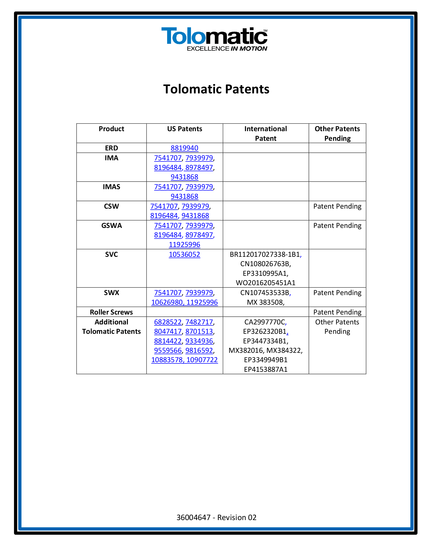 Tolomatic Patents