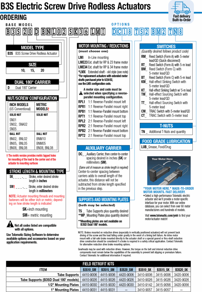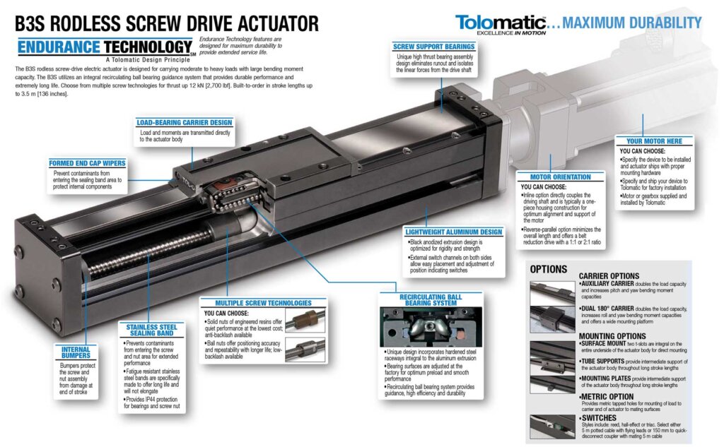 Tolomatic’s B3S is a linear screw driven rodless actuator series that has a enclosed carrier support bearing design that provides long life and high load capability. The bearings and screw are protected by a stainless steel dust band that provides a IP44 rating against dust and debris.