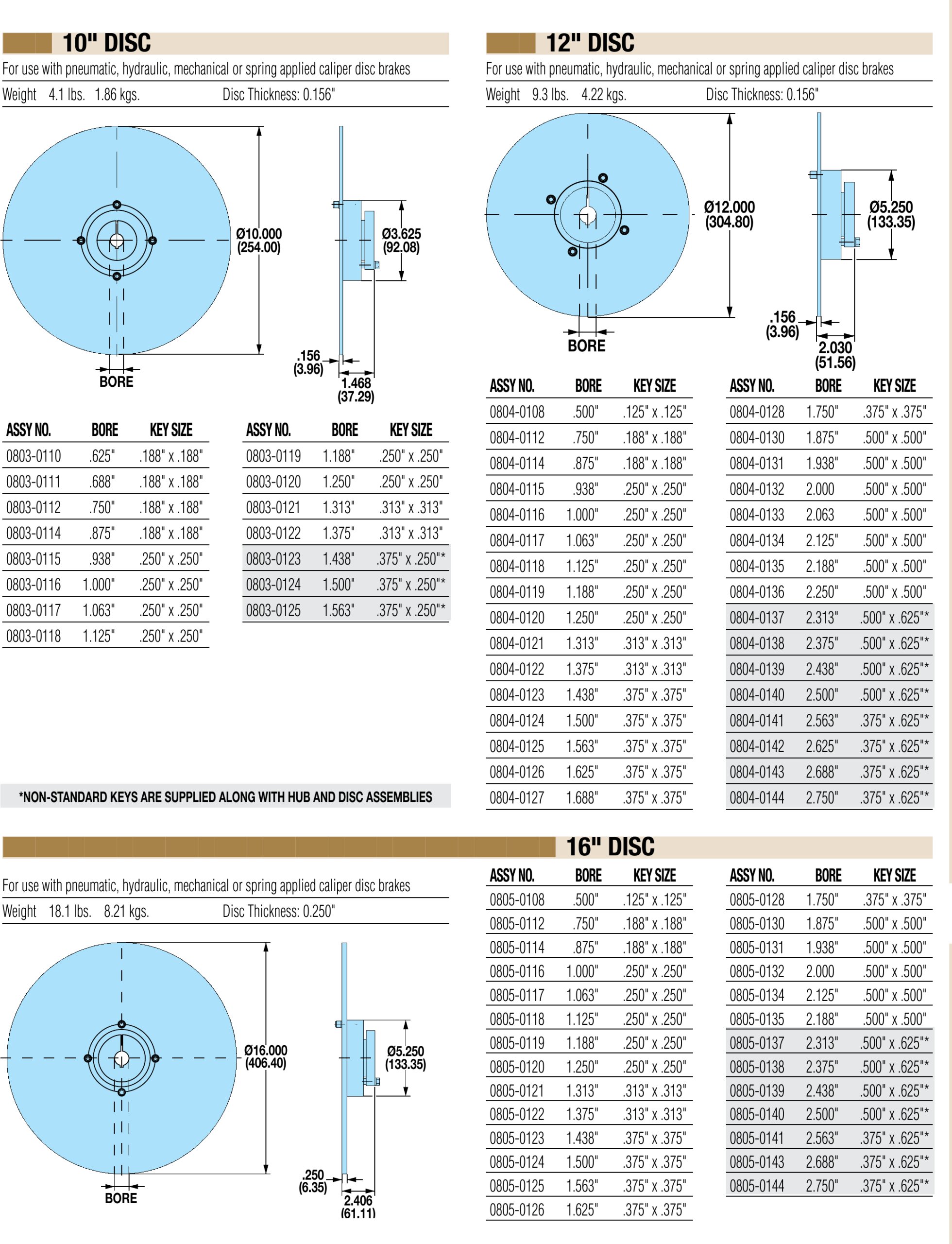 Fixed Hub & Disc Assemblies with QD Bushings: Dimensions for 10-, 12- & 16-inch Discs