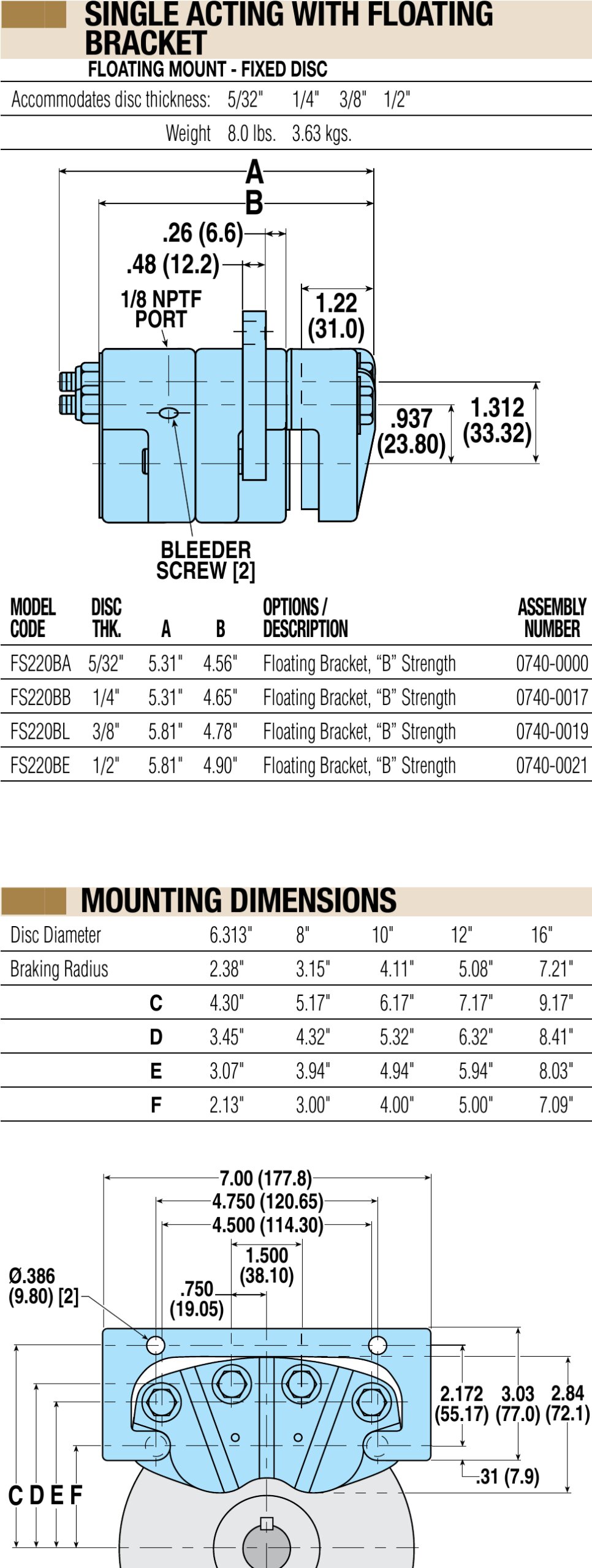 The FS220B spring applied disc brake series provides up to 6750 in-lbs (763 Nm) of static torque (based on linings with no wear). FS220B spring applied disc brakes are single acting with floating mount and fixed disc.