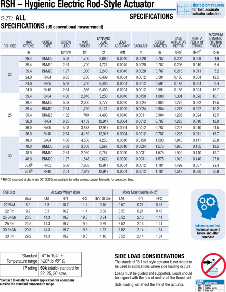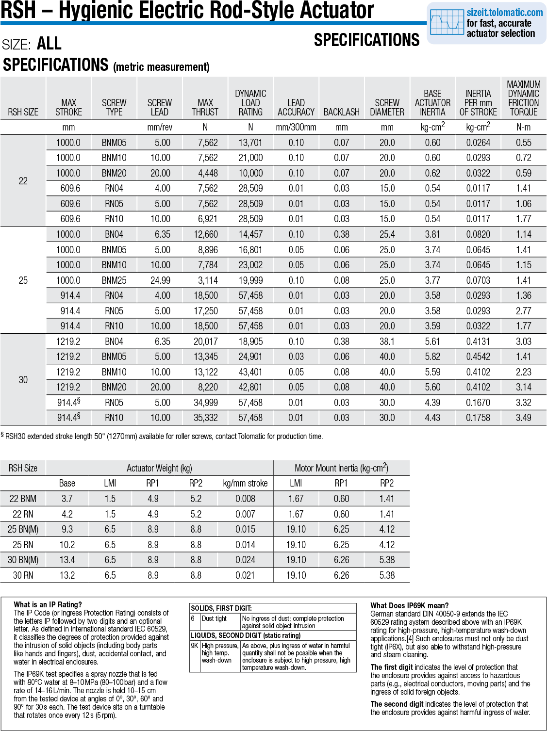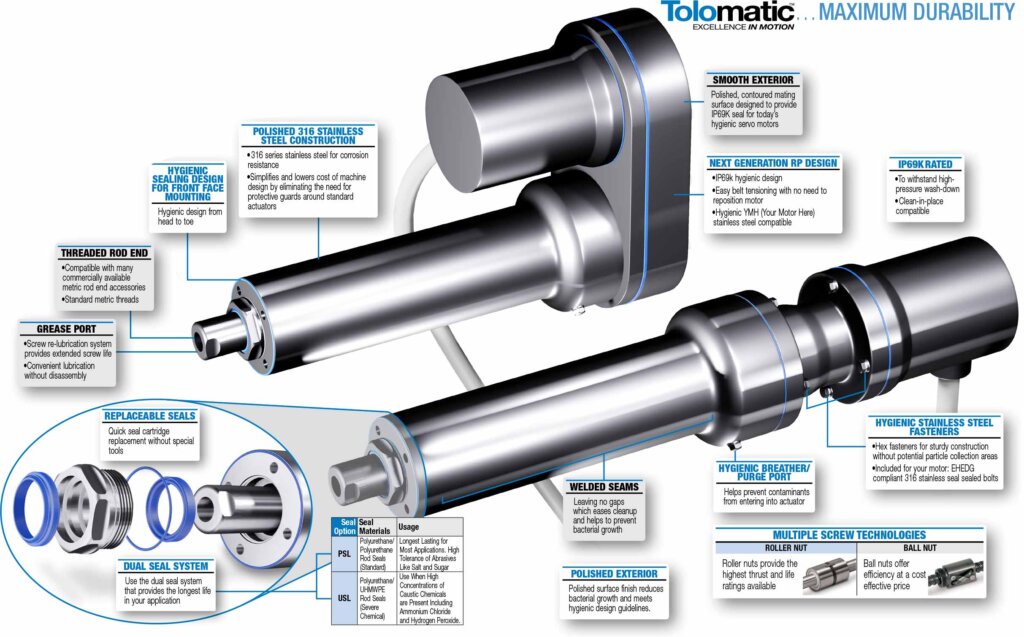 Tolomatic’s RSH line of hygienically designed stainless steel electric actuators are the perfect solution for food and beverage applications where higher forces are required for pressing, pumping, cutting or slicing. Standard motor mounts for a wide variety of stainless steel servo motor manufacturers, to make your system a complete Stainless Solution.